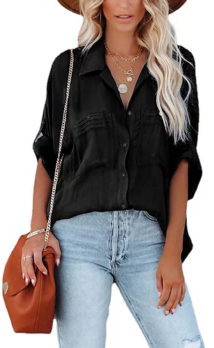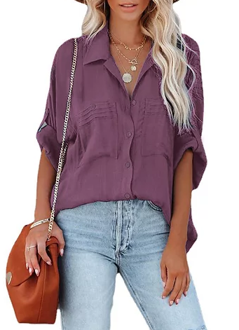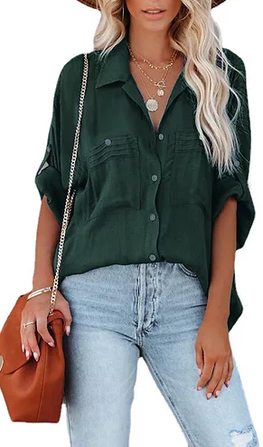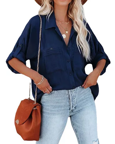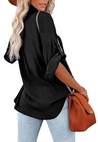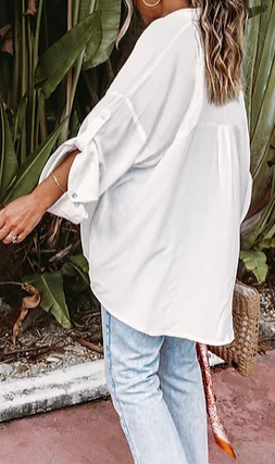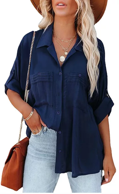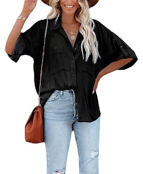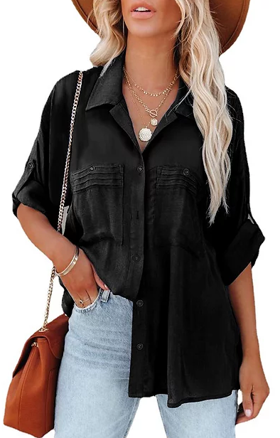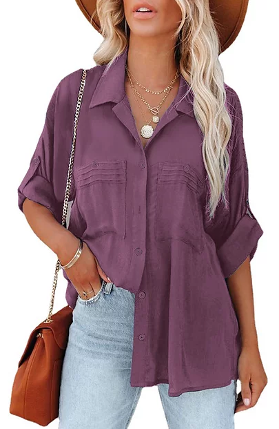 Women Oversized Front Button Two Pocket Roll Up Sleeves Shirt
