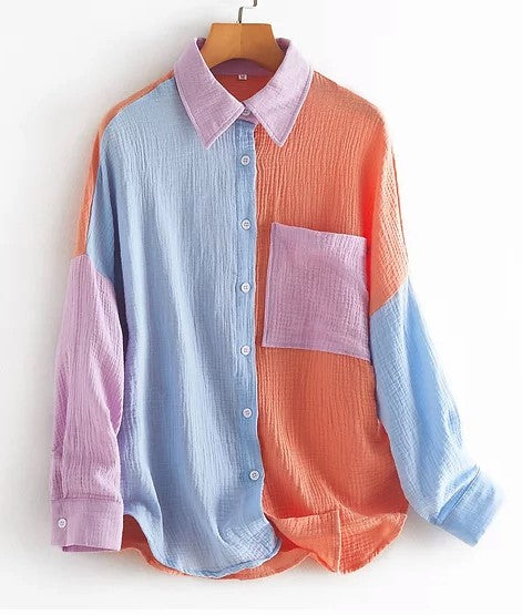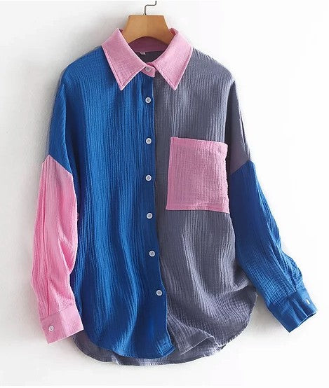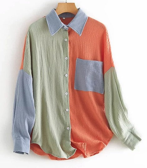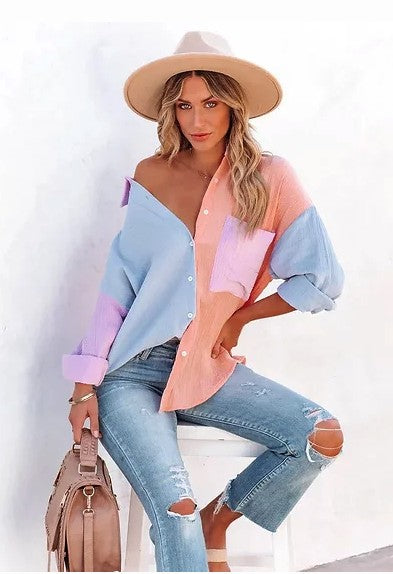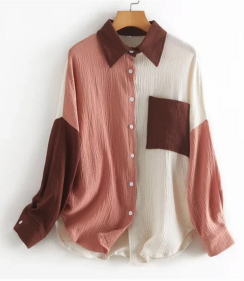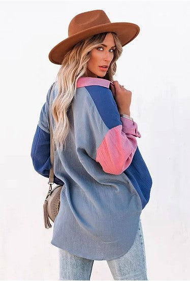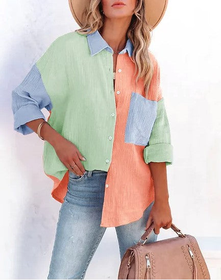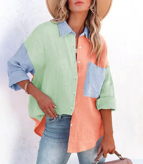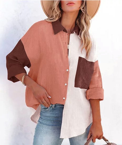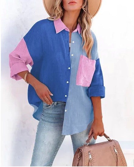 Women Loose Fit Button Up Pocket Shirt Blouse
