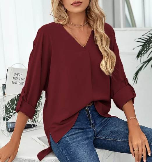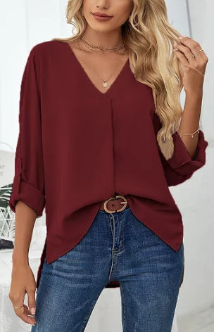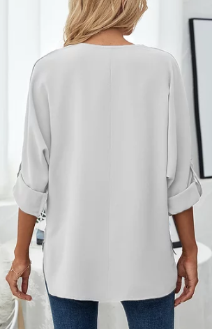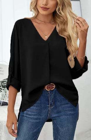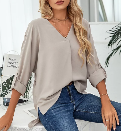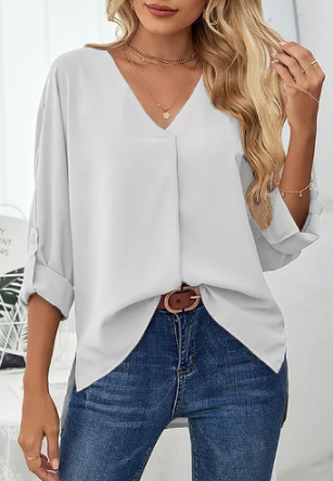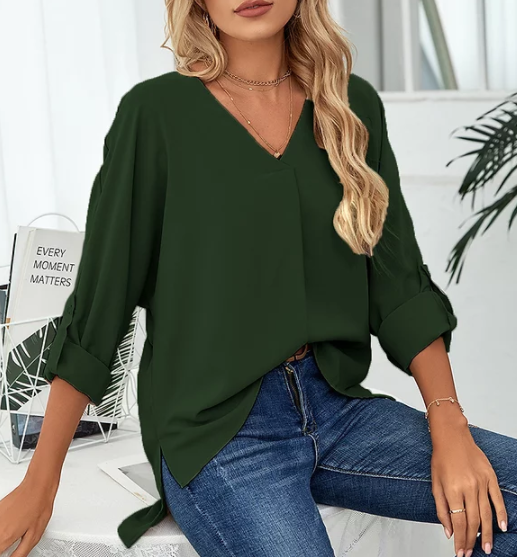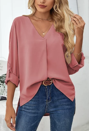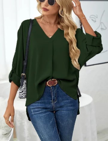 Women Casual V Neck Roll Up Sleeves Loose Blouse